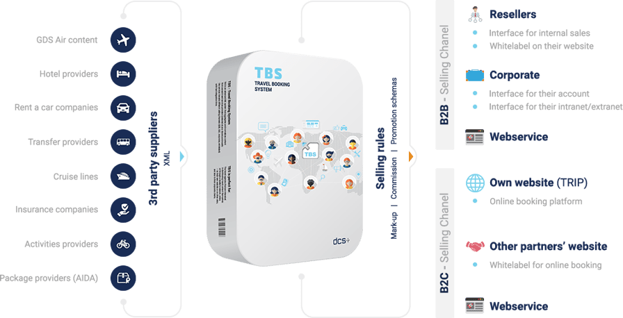 TBS is an advanced IBE system that aggregates and normalizes content from several travel services providers (selected at your desire) and resells the services towards different selling channels (B2B, B2C, corporate, whitelabel) with fast integration time.