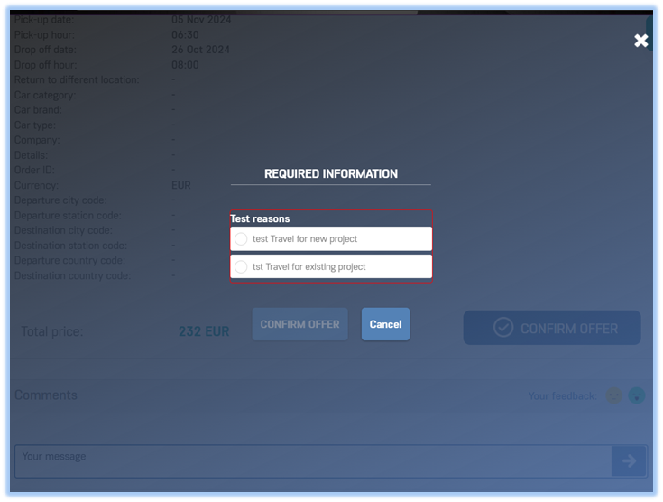 - Booking Step: These are applied when traveler confirms the offer. The traveler will have to add/select the reasons based on the admin configuration.