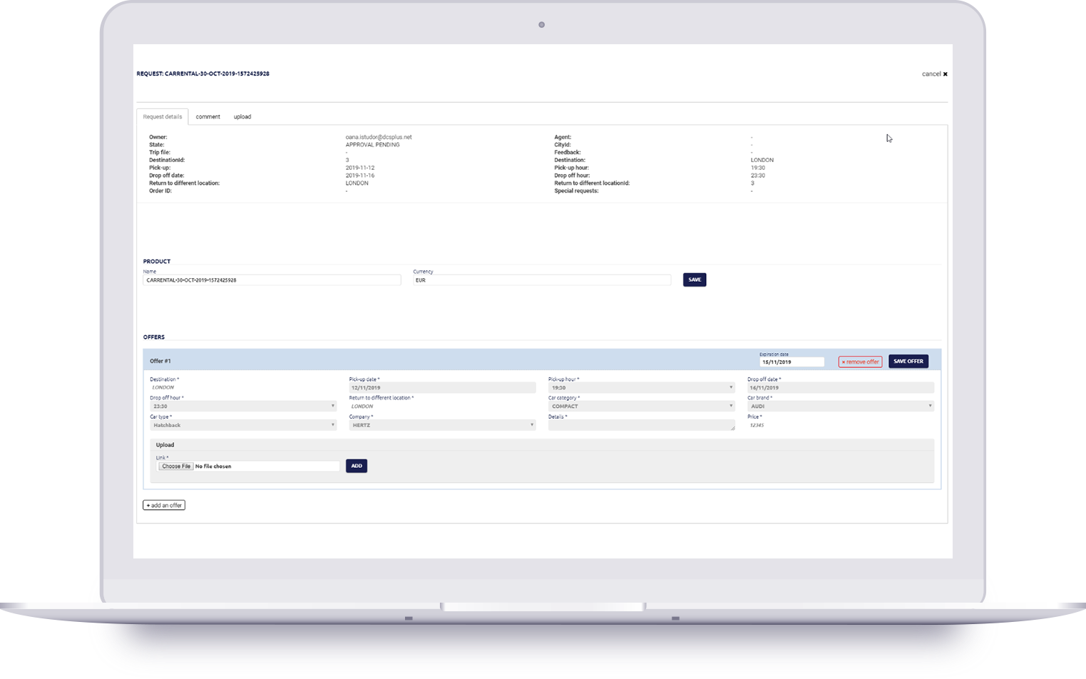 Your travel agents will see all the offline requests in NOVA, can manage all of them directly from the platform, being also able to upload and send the offers directly from the Admin section of NOVA. Further on, your corporate customers will enjoy full automation: once confirmed, the travel service will pass through the approval process, regardless how complex it is defined.