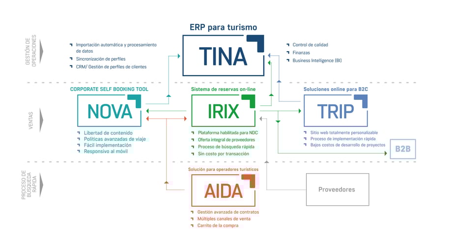 Trabajamos incansablemente para buscar soluciones que forme nuestra cartera para satisfacer mejor tus necesidades, donde adaptamos nuestras tecnologías a las especificidades del mercado. Algunos ejemplos incluyen actualizaciones de TINA, nuestro ERP de turismo mid back-office, que tiene un impacto directo en la reducción de costos, aumento de la rentabilidad y gestión de pagos en cuotas con los costos de transacción de tarjetas de crédito. Este desarrollo cumple perfectamente con los flujos de trabajo en muchos países de Latinoamérica, además, tenemos la importación de facturas de BSP y demás proveedores que facilitan operaciones financieras para la conciliación de pagos.