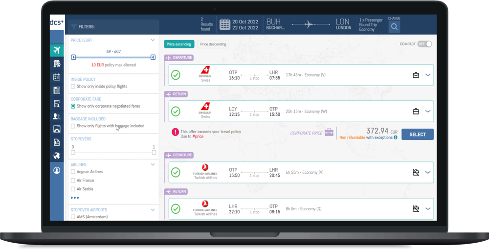 Su cliente corporativo ahora tiene la posibilidad de elegir paquetes de vuelo predefinidos de acuerdo a sus necesidades. Con las tarifas de marca, directamente de las aerolíneas, su cliente será fácilmente guiado para seleccionar su vuelo y ciertos servicios de vuelo adicionales que se adapten a sus necesidades: embarque prioritario, equipaje adicional, acceso a la sala VIP, espacio adicional para las piernas y muchas otras opciones de reserva de vuelos rápidas y precisas.