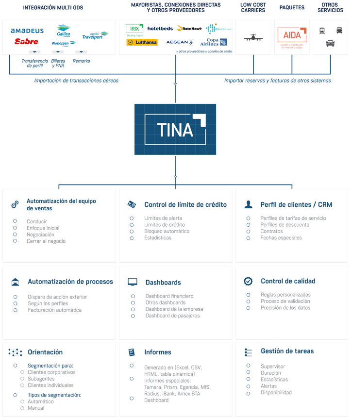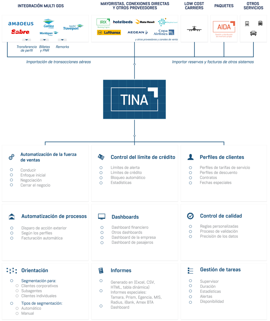 TINA, uno de los sistemas ERP basados en la web más avanzados del mundo para la industria del turismo, tiene como objetivo maximizar la gestión y los flujos operativos de una agencia de viajes o operador, con el objetivo de aumentar la eficiencia y la productividad. La solución TINA es una planificación de recursos empresariales (ERP) especialmente diseñada para ayudar a los profesionales del turismo a gestionar su flujo de trabajo.